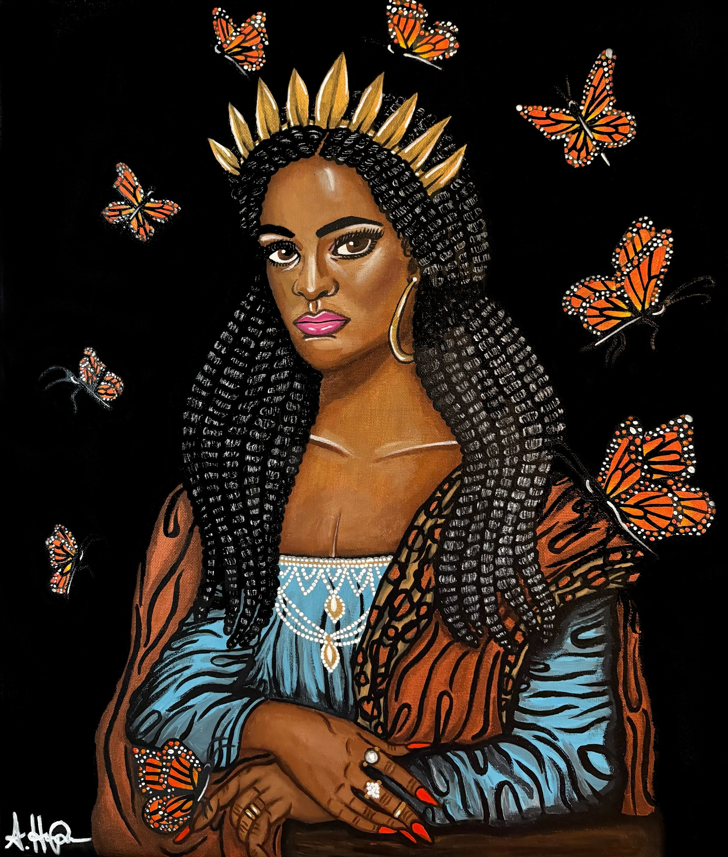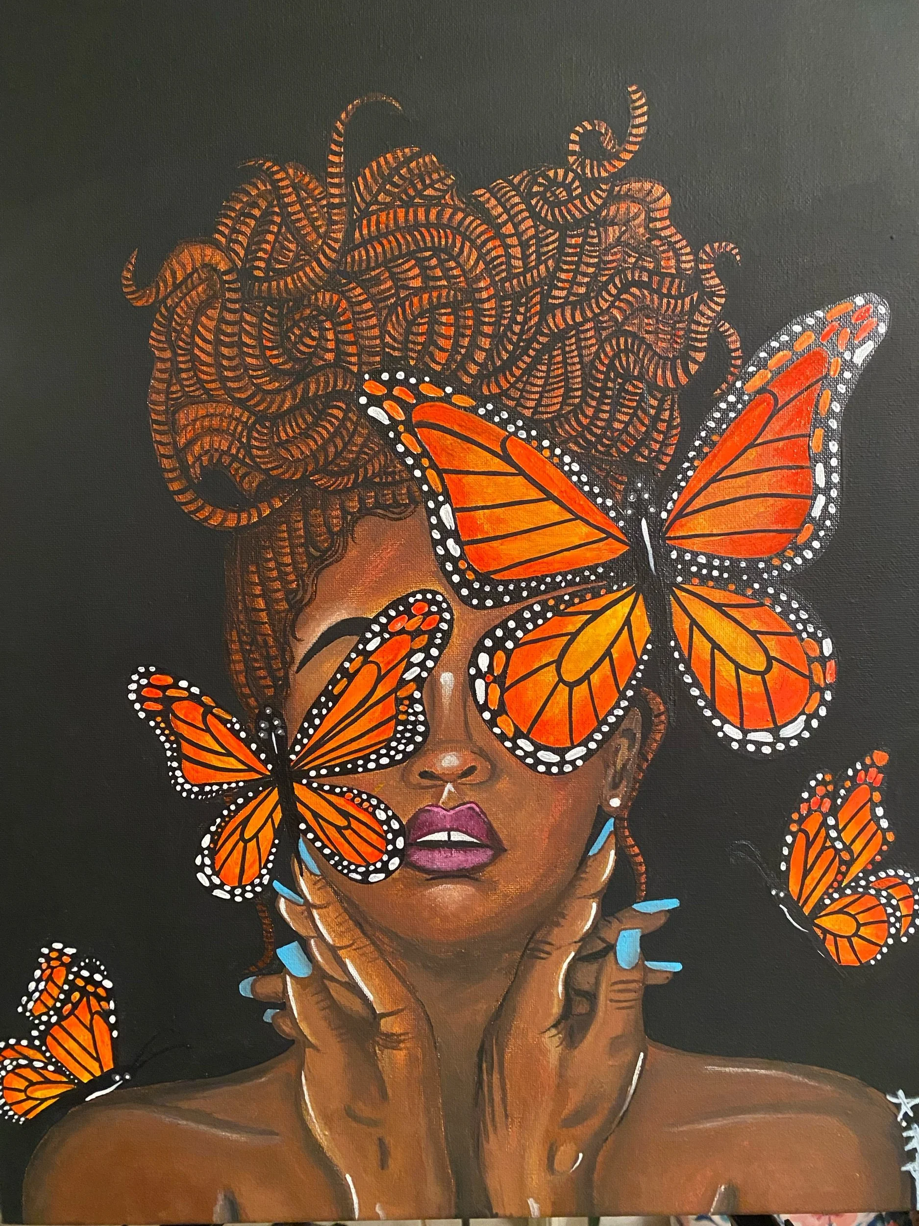 Ashley’s latest life endeavors lead her to create this butterfly series. She began these paintings thinking as a caterpillar…small and rediscovering life. As she began to feel all the emotions that come with growth and change, she felt that God transformed her into a chrysalis allowing her to metamorphose into a stronger, more resilient person. She began to nurture herself and grow stronger, persevering through all the obstacles of life. She emerged from her chrysalis as a beautiful, peaceful, graceful butterfly, ready to showcase to the world all that she has to offer. She is the strength of a butterfly.